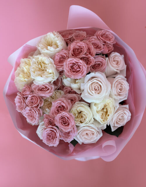 Пионовидные розы, кустовые розы и тщательно отобранные сезонные сорта объединяются в композициях, где гармония важнее эффектности. Каждый элемент формирует общее впечатление — текстура лепестков, плотность бутона, глубина цвета.
