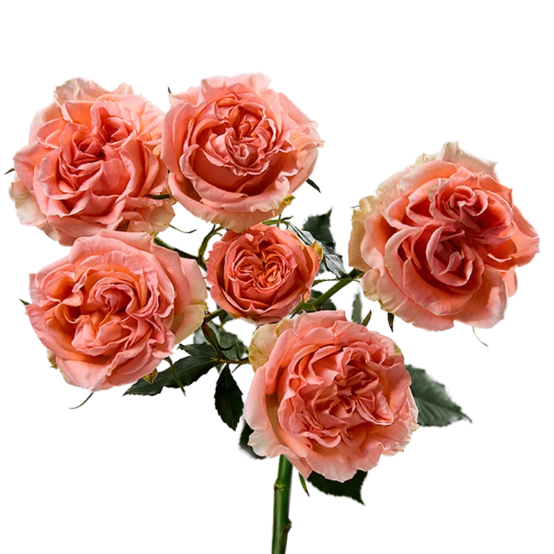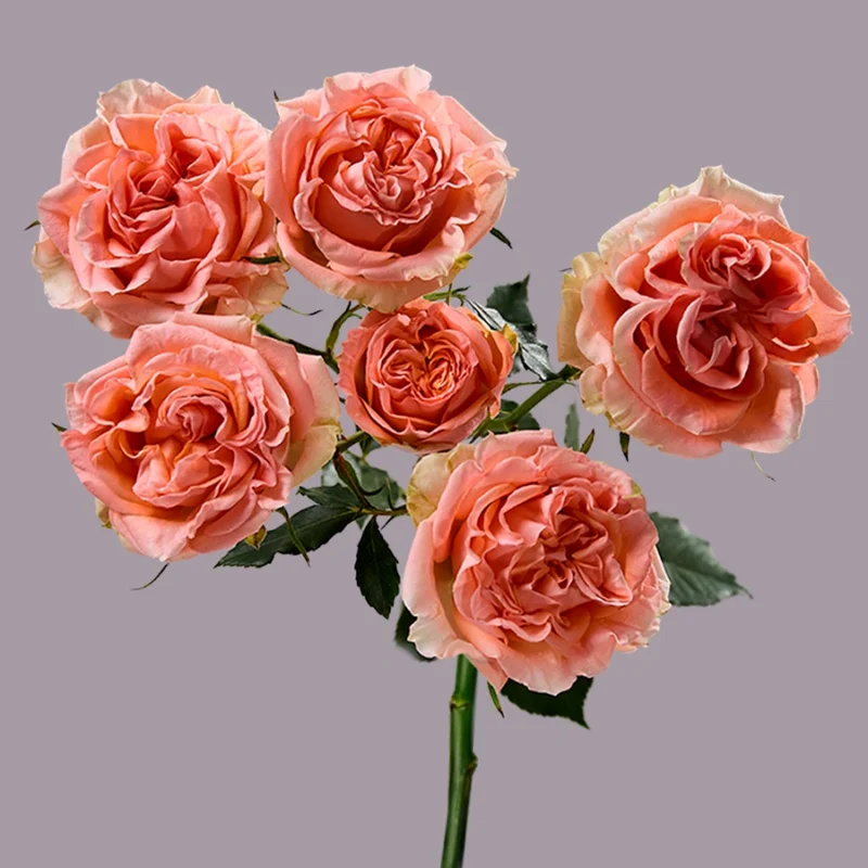 Нежные шёлково-персиково-корралловые соцветия в этой воздушной спрей‑розе придают ощущение свежести сада. Её объем и легкость идеально подойдут для весенних или причудливых букетов.