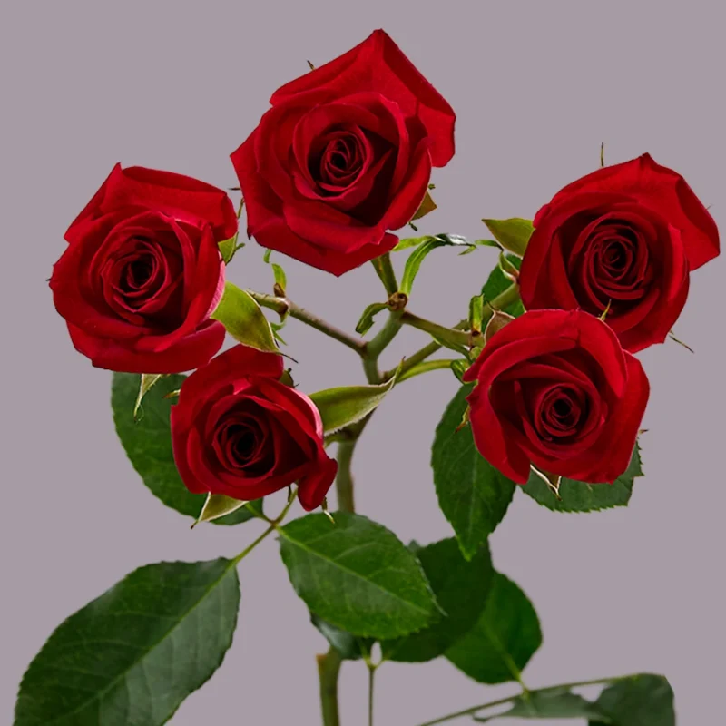 Смелая и страстная, эта спрей‑роза поражает глубокими красными тонами и сильным присутствием. Идеальна для драматичных и роскошных композиций.