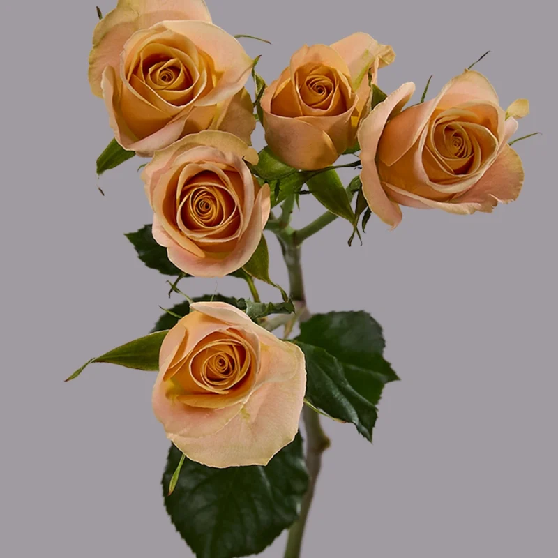 Самая длинная спрей‑роза в нашей коллекции, она сочетает кремовые и песочные тона, дополняемые оттенками окраса цвета. Великолепна для высоких и воздушных композиций.