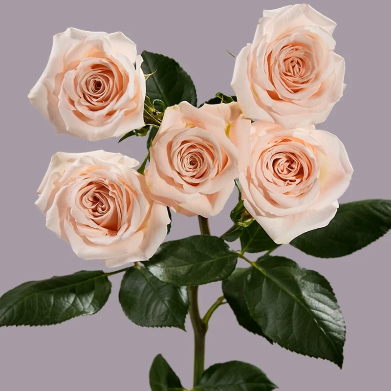 Светло-розовая спрей‑роза с крупными бутонами и совершенным раскрытием — символ нежности, доброты и трепета в композициях.