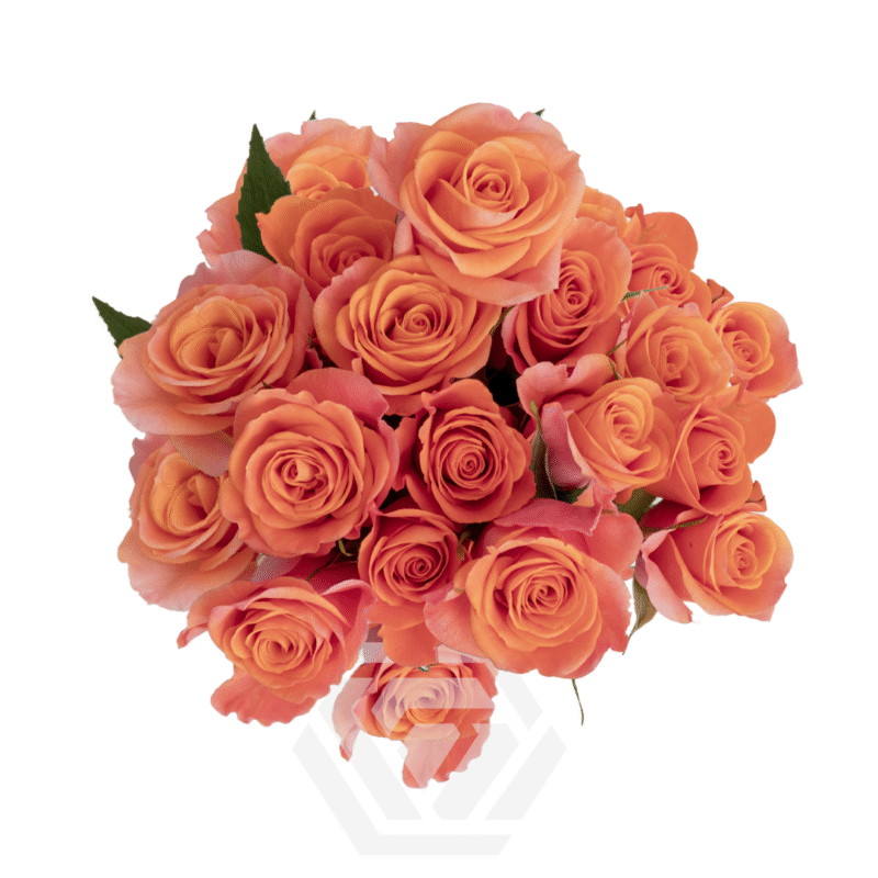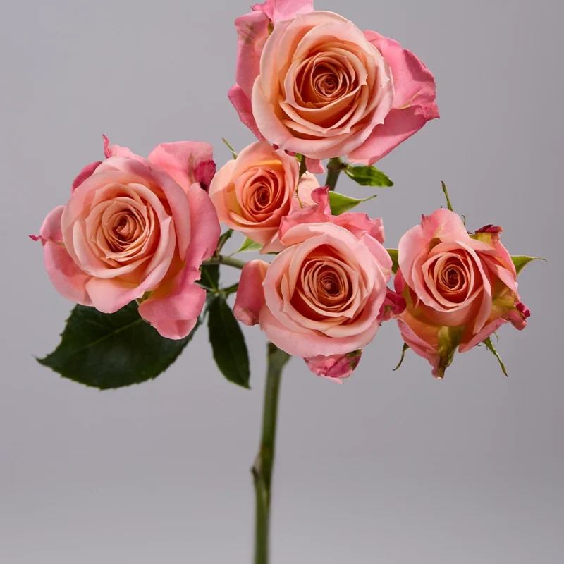 Очаровательная спрей‑роза с внешними лепестками персиково-розового оттенка и ярко-персиковым центром — игривая и яркая комбинация!